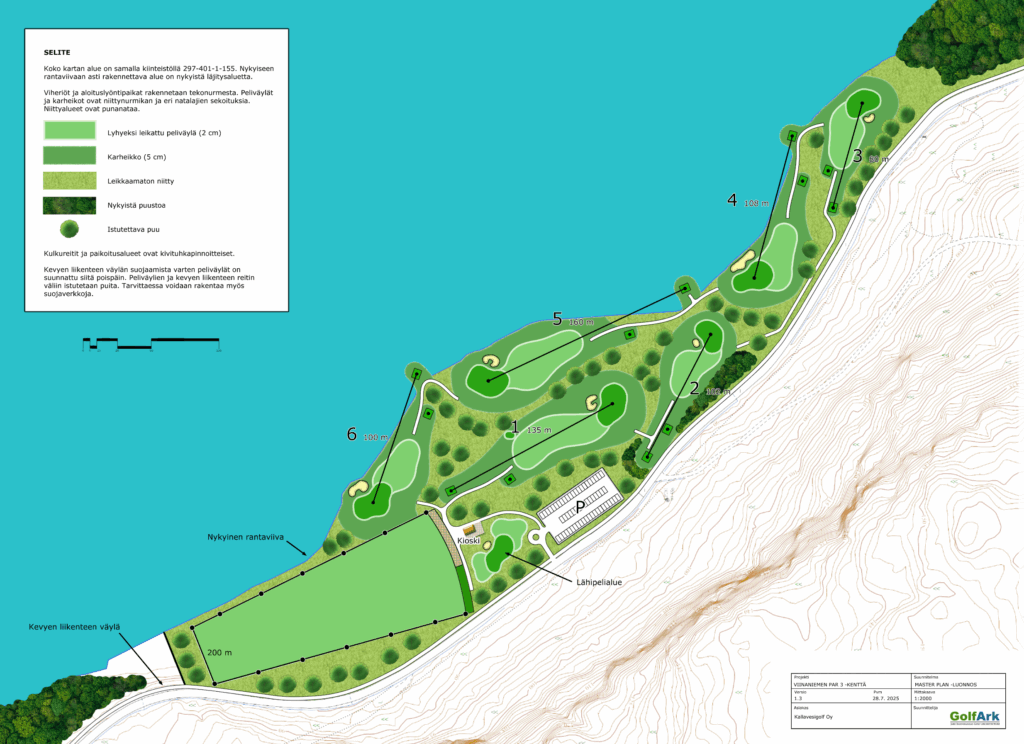 Kuuden väylän tasoituskelpoinen par-3 kenttä Viinaniemen alueelle.